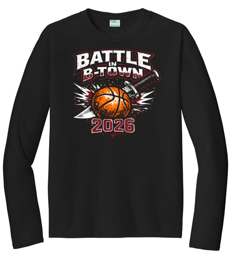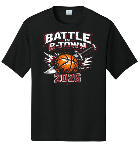 The Battle in B-Town short or long sleeve drifit performance tee is available on a Port & Co drifit tee. If you would like a name on the back of your garment, please add name in Notes section at checkout. Also please put team name in Notes at Checkout so that we can sort orders for easy distribution.