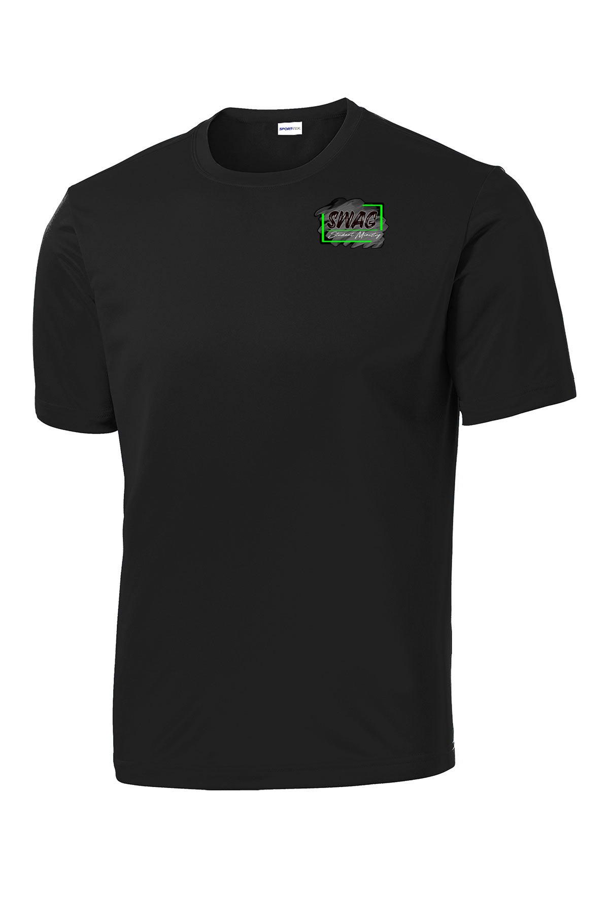 The Swag Drifit Tee is available on a Sport Tek Drifit tee in Black in Short or Long sleeve option. You can choose between hot pink or lime green graphic.