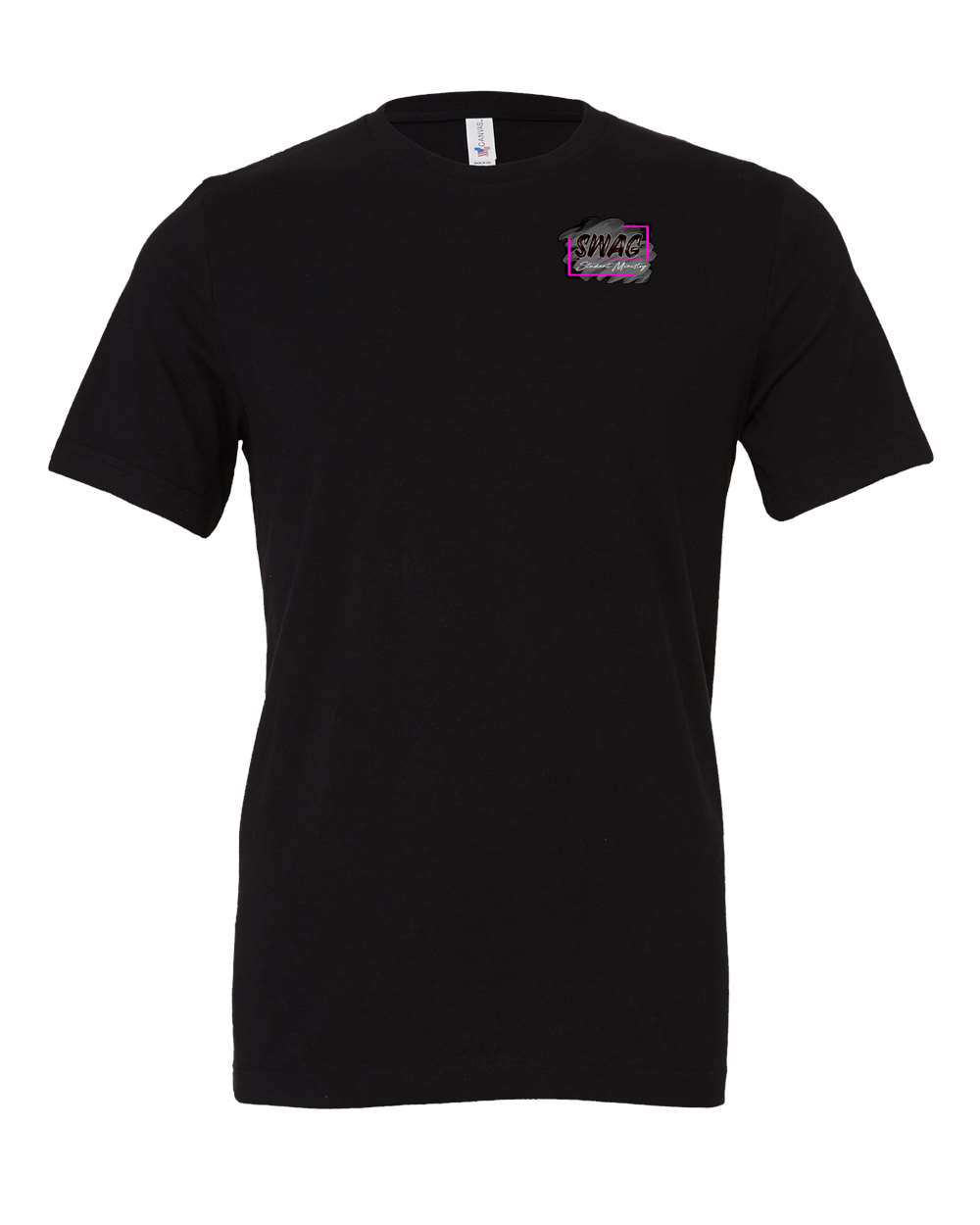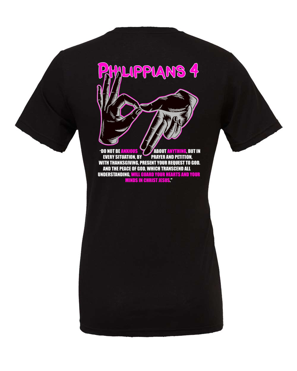 The Swag Philippians 4 Tee is available on Bella Canvas, Gildan Softstyle, or Comfort Colors tee shirts in Black. You have a choice of lime green or hot pink logo and a short or long sleeve option.